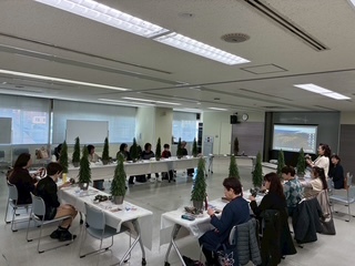 2025年11月19日(水)、フラワーデザインワークショップを開催いたしました。講師は当女性会の会員であり、(公社)日本フラワーデザイナー協会公認校Hana-ismフローラルアートスクール主宰・伊藤順子氏 にご担当いただきました。当日は想像よりも大きな「もみの木」に、リースやリボン、可愛らしいオーナメントを飾り付け、参加者それぞれの個性があふれるクリスマスツリーが完成しました。理論も学びつつ、無心で手を動かす心地よい時間となり、皆さまからも「集中できて癒された」との声が聞かれました。さらに、この作品はクリスマス後にはお正月用アレンジへと変形できる優れもの。自宅に飾って眺めると、自然と喜びがあふれてまいりました。私たち女性会では、このような学びや交流の機会を通じて、楽しく活動を続けております。一緒に活動してみませんか?興味のある方は、どうぞお気軽にお問い合わせください。