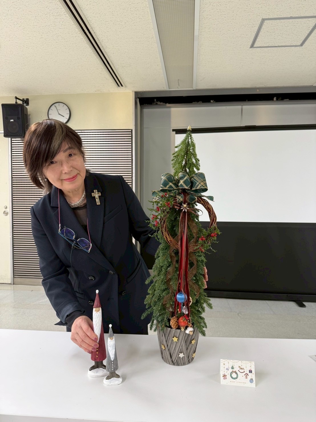 2025年11月19日(水)、フラワーデザインワークショップを開催いたしました。講師は当女性会の会員であり、(公社)日本フラワーデザイナー協会公認校Hana-ismフローラルアートスクール主宰・伊藤順子氏 にご担当いただきました。当日は想像よりも大きな「もみの木」に、リースやリボン、可愛らしいオーナメントを飾り付け、参加者それぞれの個性があふれるクリスマスツリーが完成しました。理論も学びつつ、無心で手を動かす心地よい時間となり、皆さまからも「集中できて癒された」との声が聞かれました。さらに、この作品はクリスマス後にはお正月用アレンジへと変形できる優れもの。自宅に飾って眺めると、自然と喜びがあふれてまいりました。私たち女性会では、このような学びや交流の機会を通じて、楽しく活動を続けております。一緒に活動してみませんか?興味のある方は、どうぞお気軽にお問い合わせください。